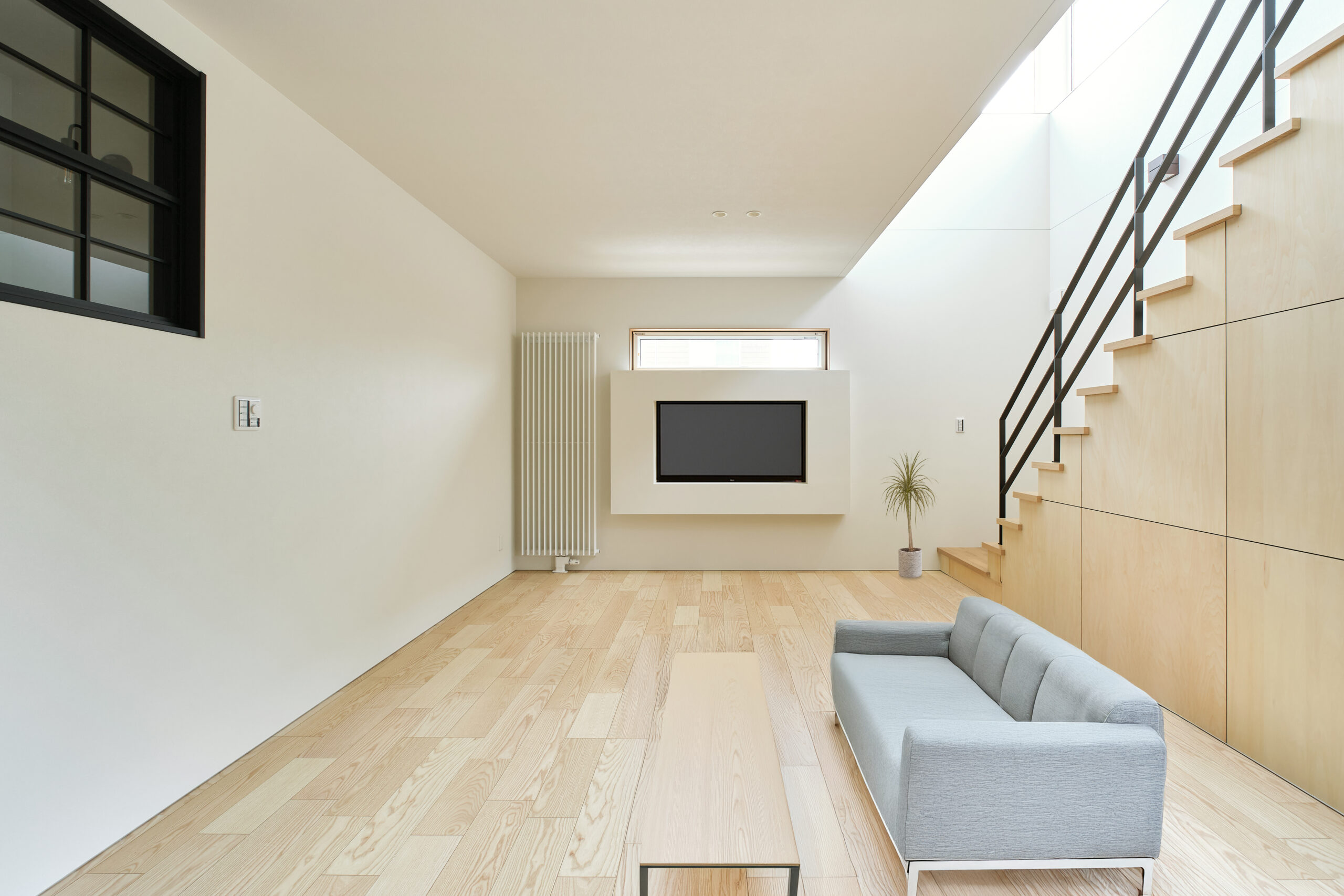 午後のやわらかな光を家の奥まで導く採光計画。眩しさを抑えた拡散光が壁・天井で反射し、季節を通じて均一で心地よい明るさをつくります。